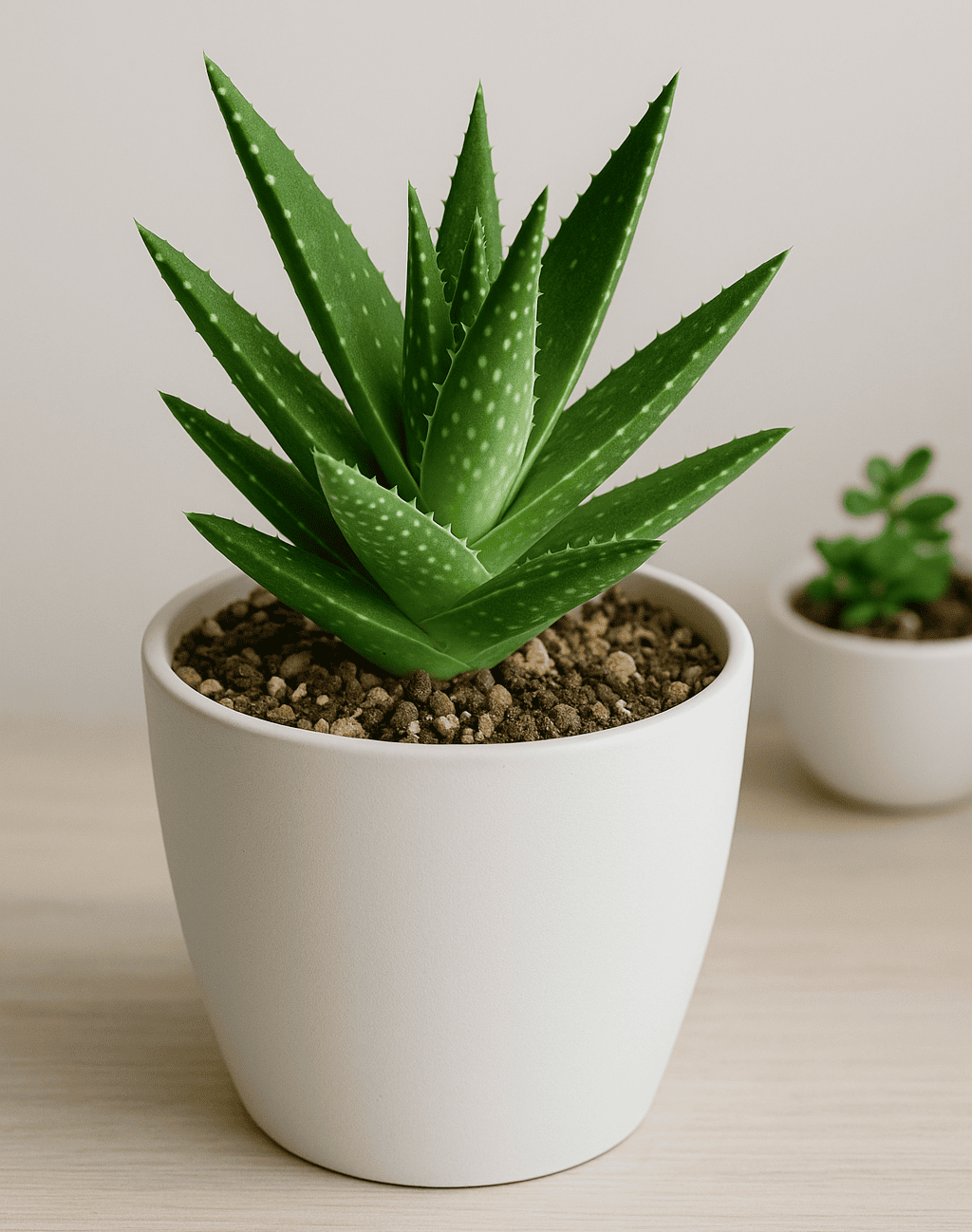Aloë vera behoort tot de vetplantenfamilie. Net zoals mini vetplantjes en mini cactusjes slaat hij water op in zijn dikke bladeren, waardoor hij lange periodes zonder water kan overleven. Dat maakt hem ideaal voor drukke huishoudens of mensen die soms vergeten hun planten water te geven. Bovendien bevat het blad een verzachtende gel die al eeuwenlang wordt gebruikt voor huidverzorging en kleine wondjes.
