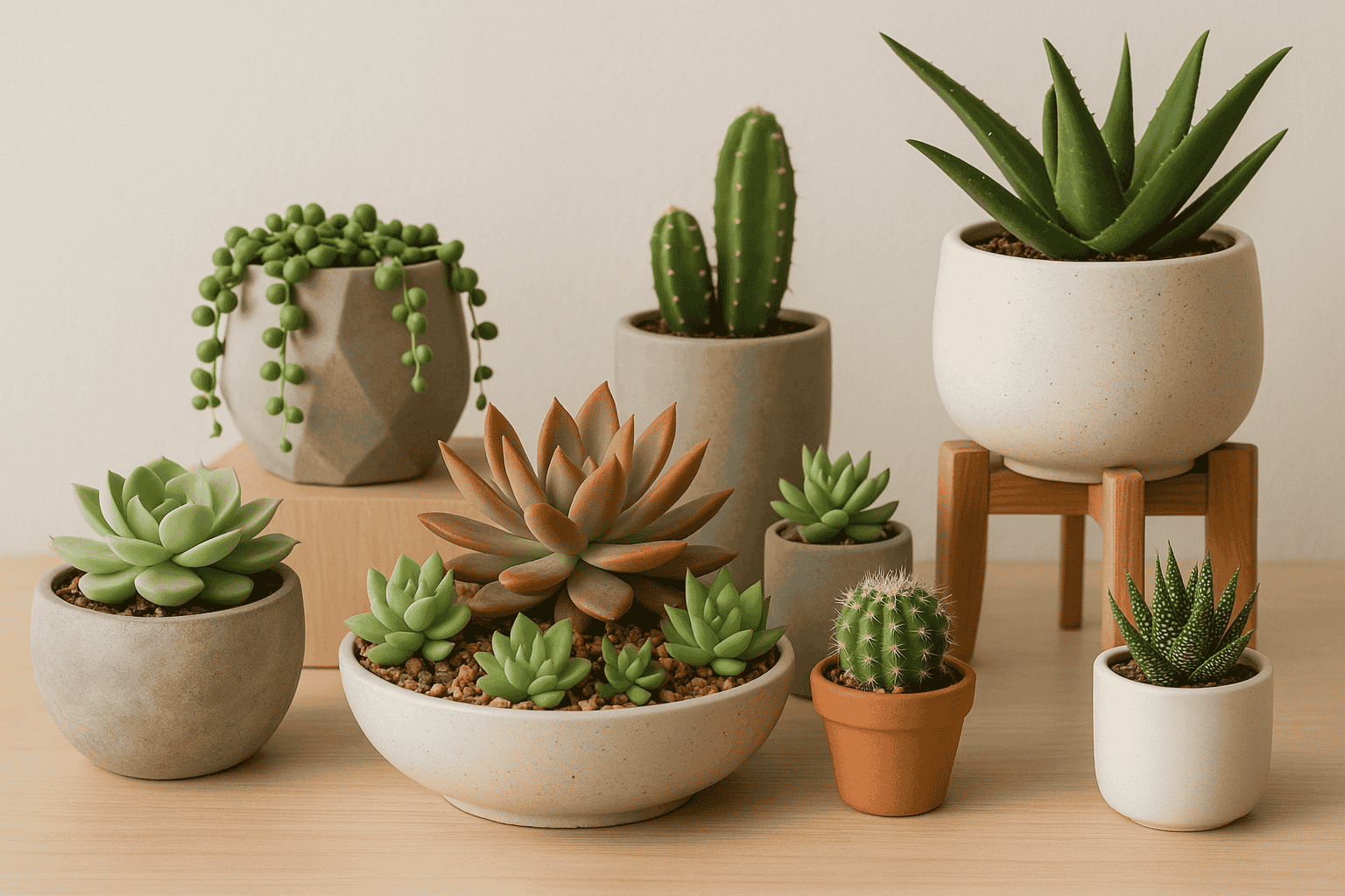 - Mini-cactustuin in een lage schaal – Combineer meerdere soorten voor een woestijnlook
