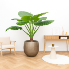 De grote bladeren groeien in een waaiervormige structuur omhoog en hebben diepe nerven met een glanzend groene kleur. Dankzij de stevige enkele stam blijft de plant mooi rechtop staan, wat zorgt voor een sterk architecturaal accent. De Alocasia Portodora enkele stam is niet alleen decoratief, maar ook luchtzuiverend en sfeerbepalend.