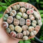 Lithops bestaat uit twee dikke, vlezige bladeren met prachtige patronen en subtiele kleurverschillen, variërend van grijs en beige tot groen en roodbruin. In het juiste seizoen verrast de plant met een elegante bloem in wit of geel – een magisch contrast met zijn minimalistische vorm.